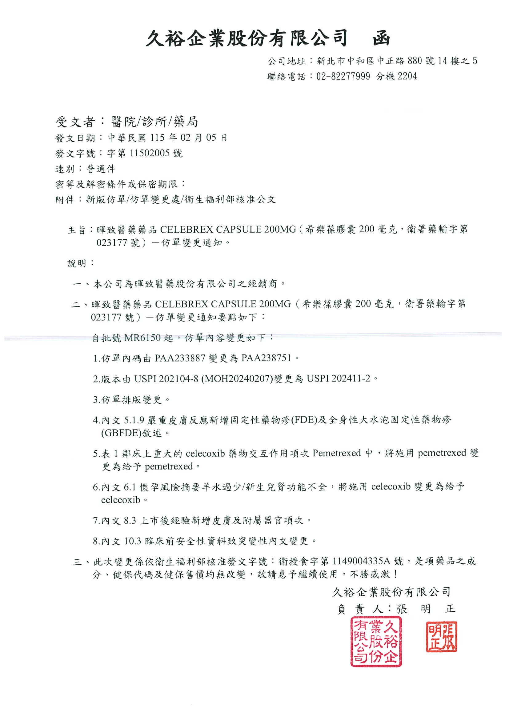 仿單變更通知,說明段如下: