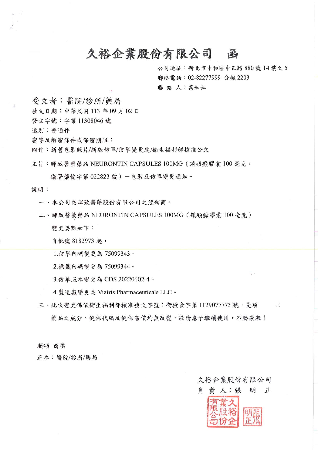 鎮頑癲膠囊NEURONTIN 100mg ー包裝及仿單變更通知