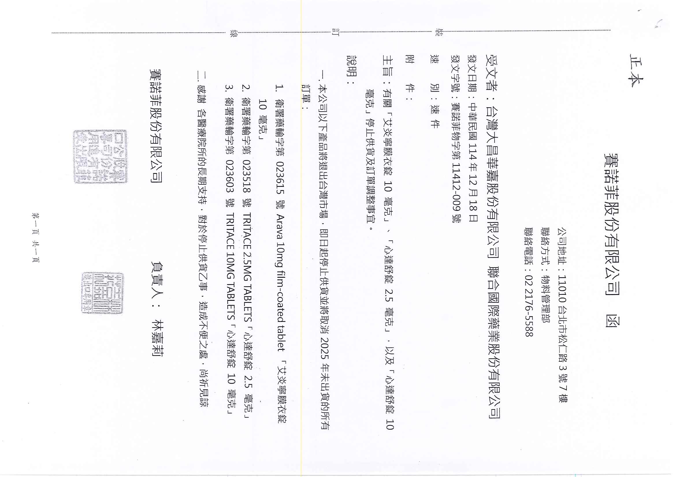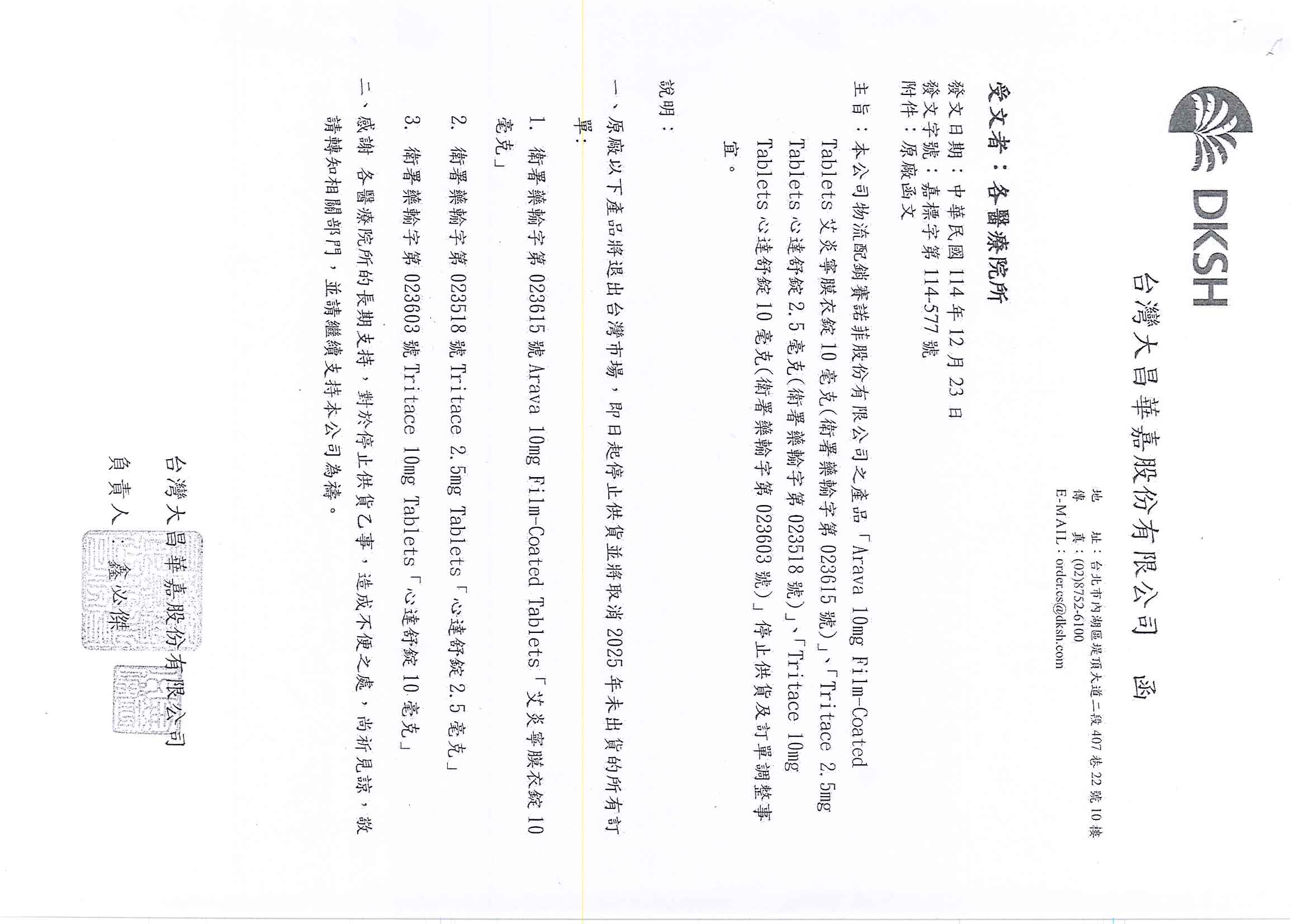 心達舒錠Tritace 10mg Tablets停止供貨及訂調整事宜請參考如下: