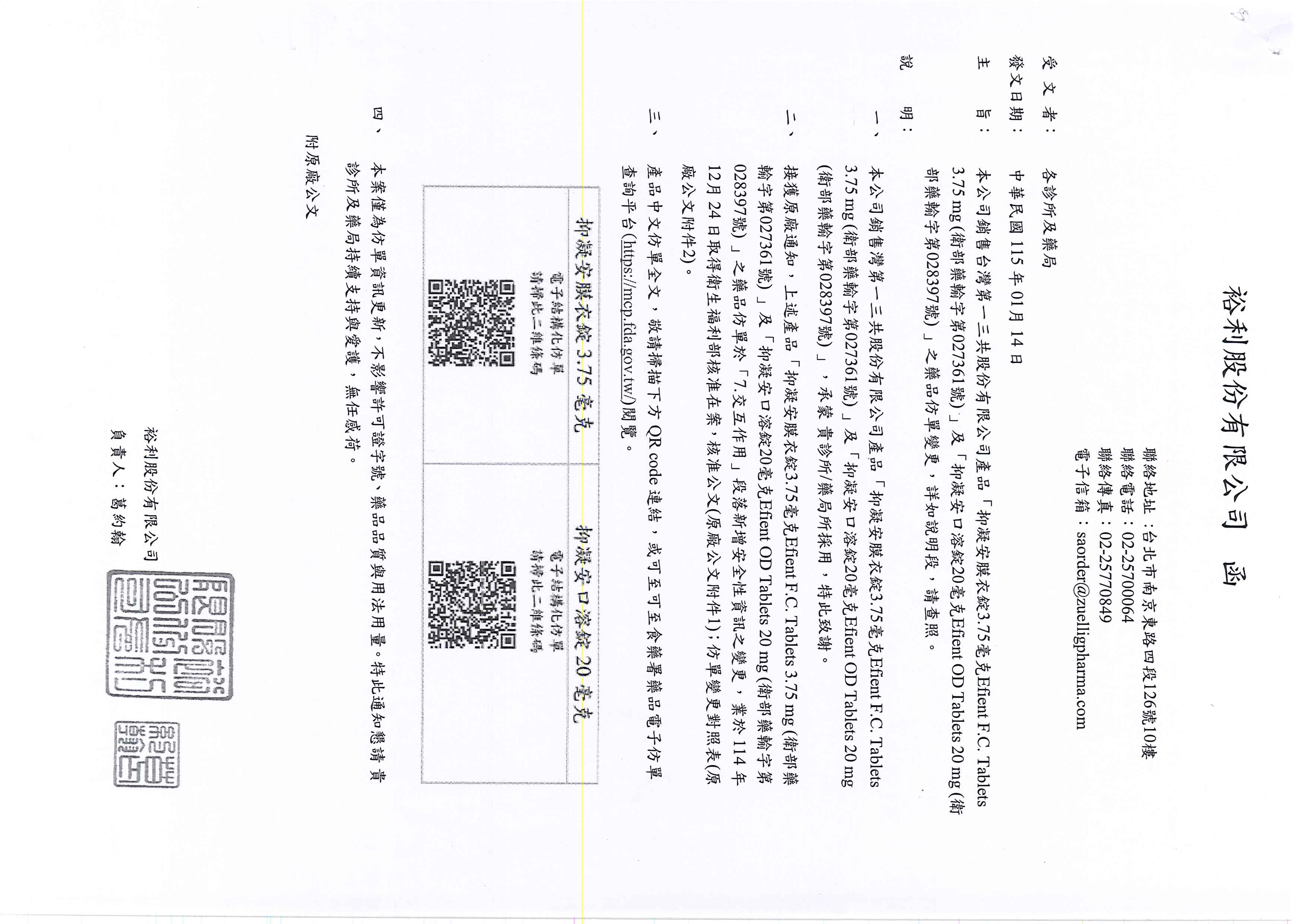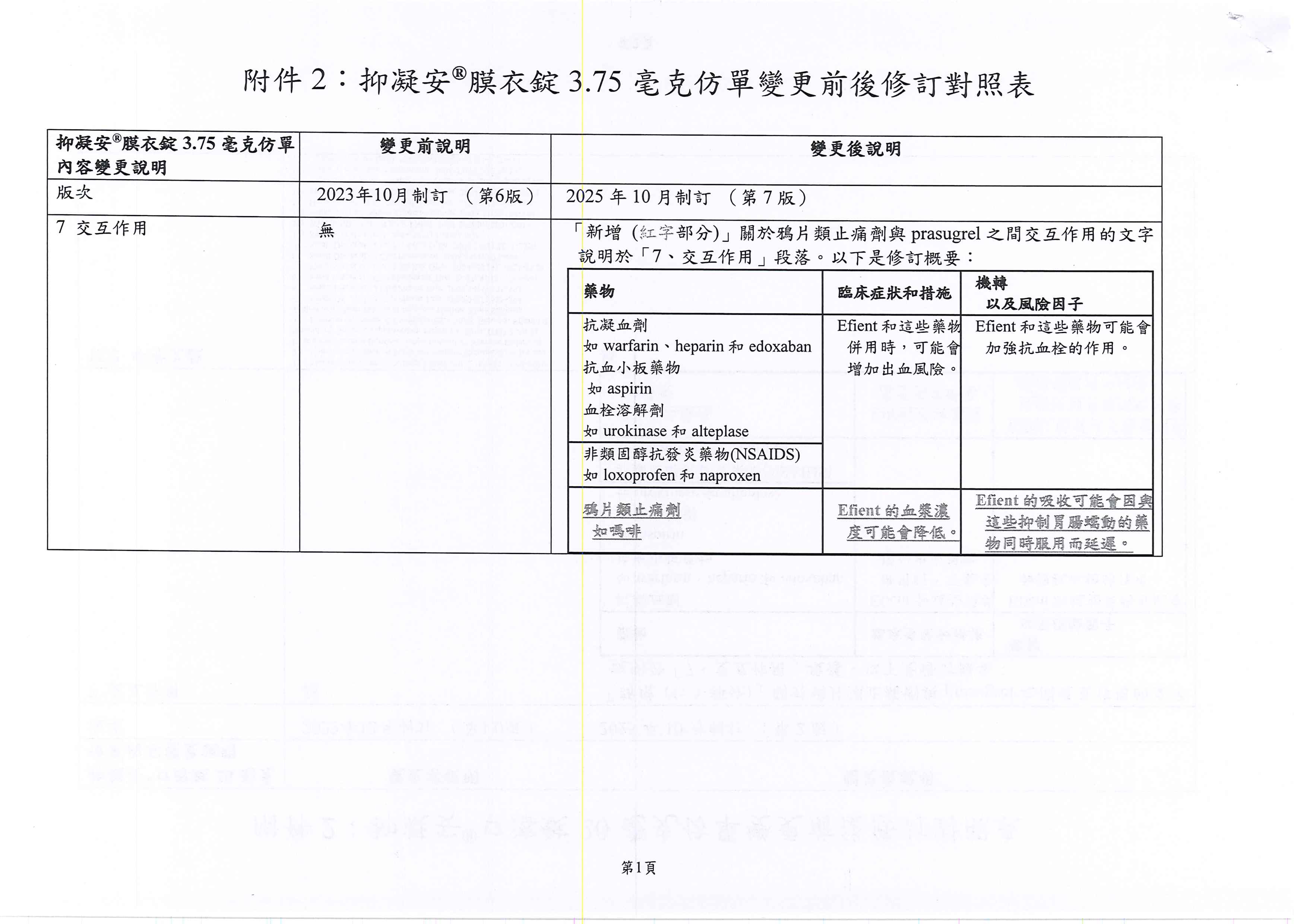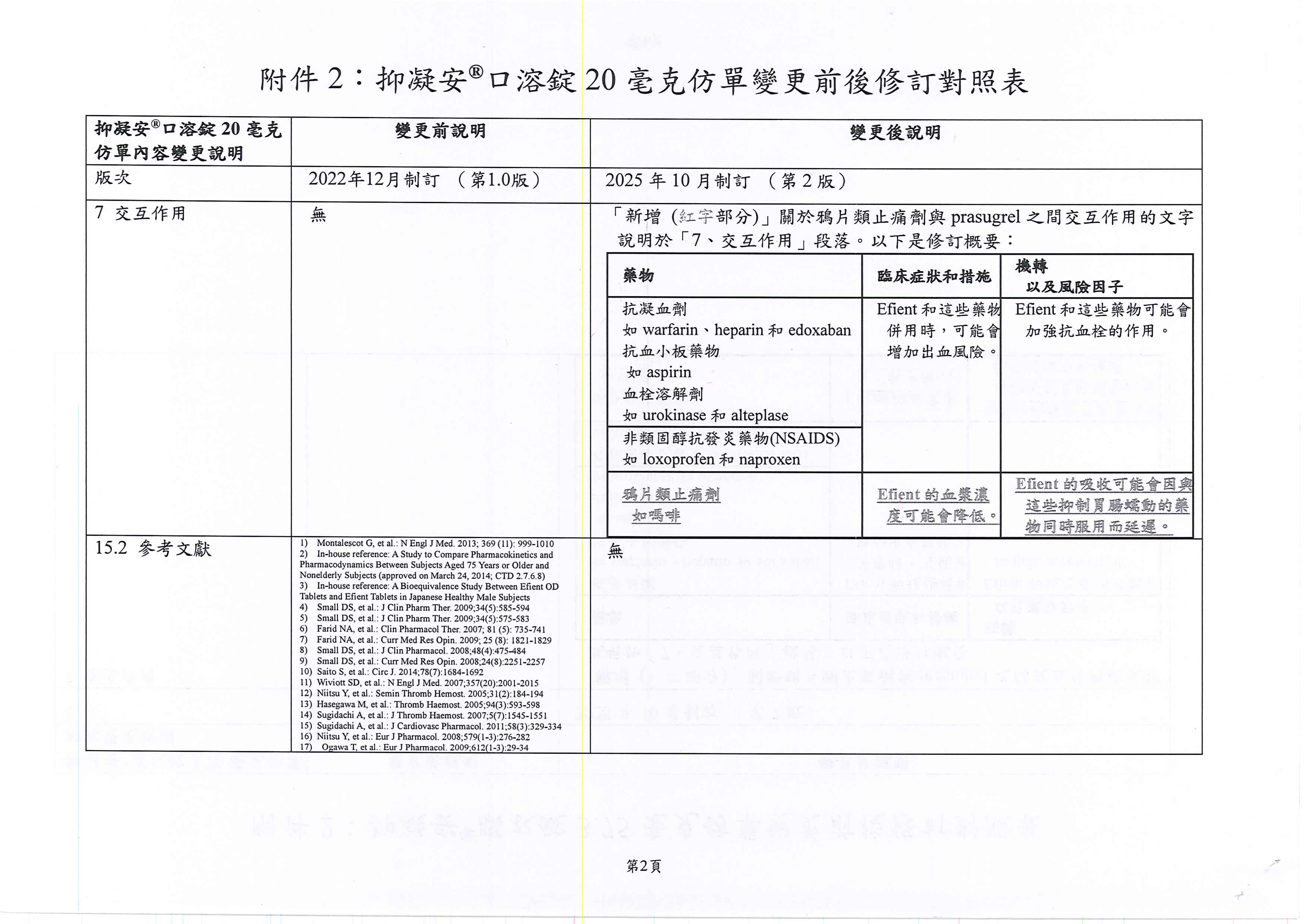 抑凝安膜衣錠 3.75毫克(Efient F.C. Tablets 3.75 mg)、抑凝安口溶錠 20毫克(Efient OD Tablets 20 mg)藥品仿單變更,詳如下說明段: