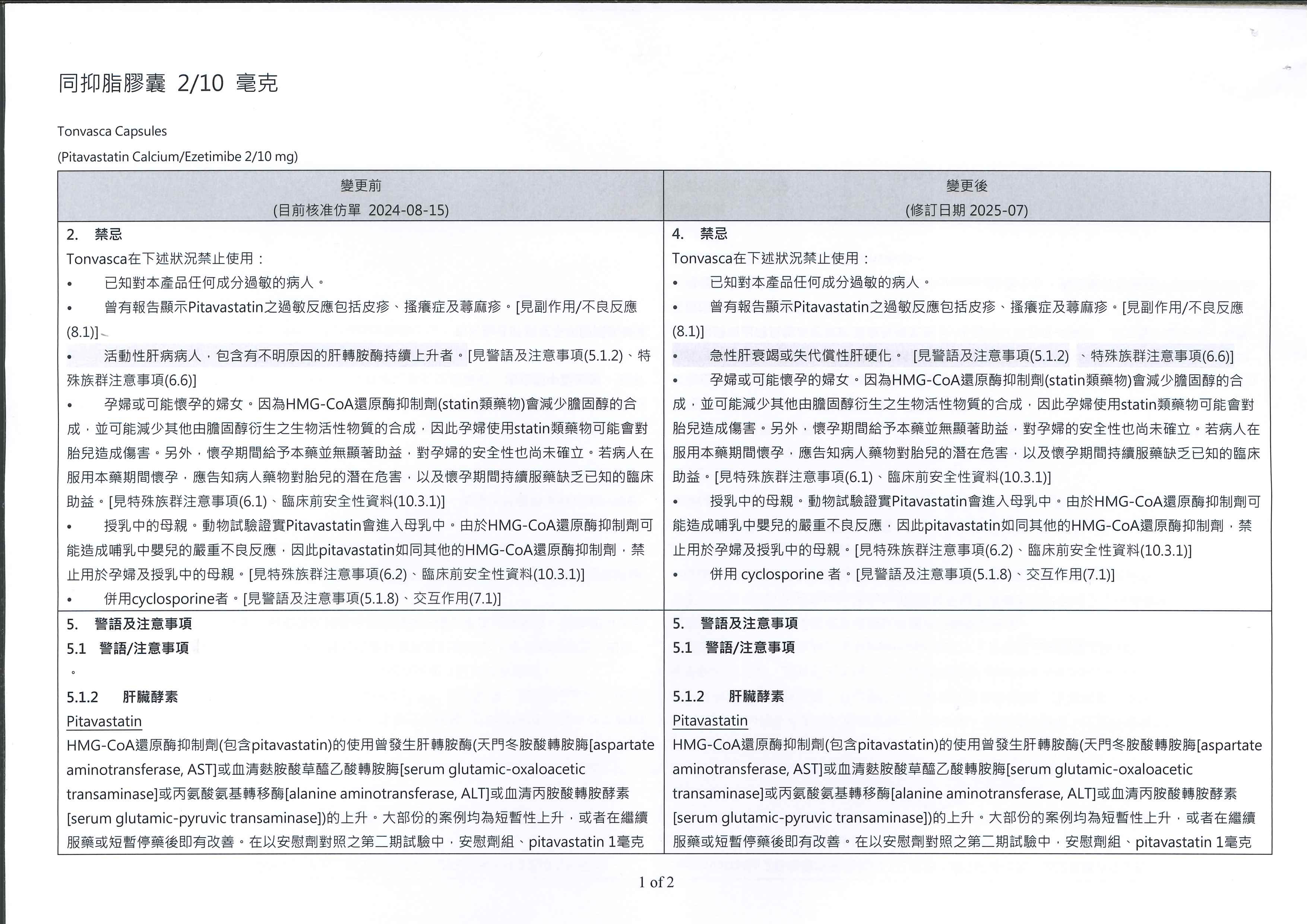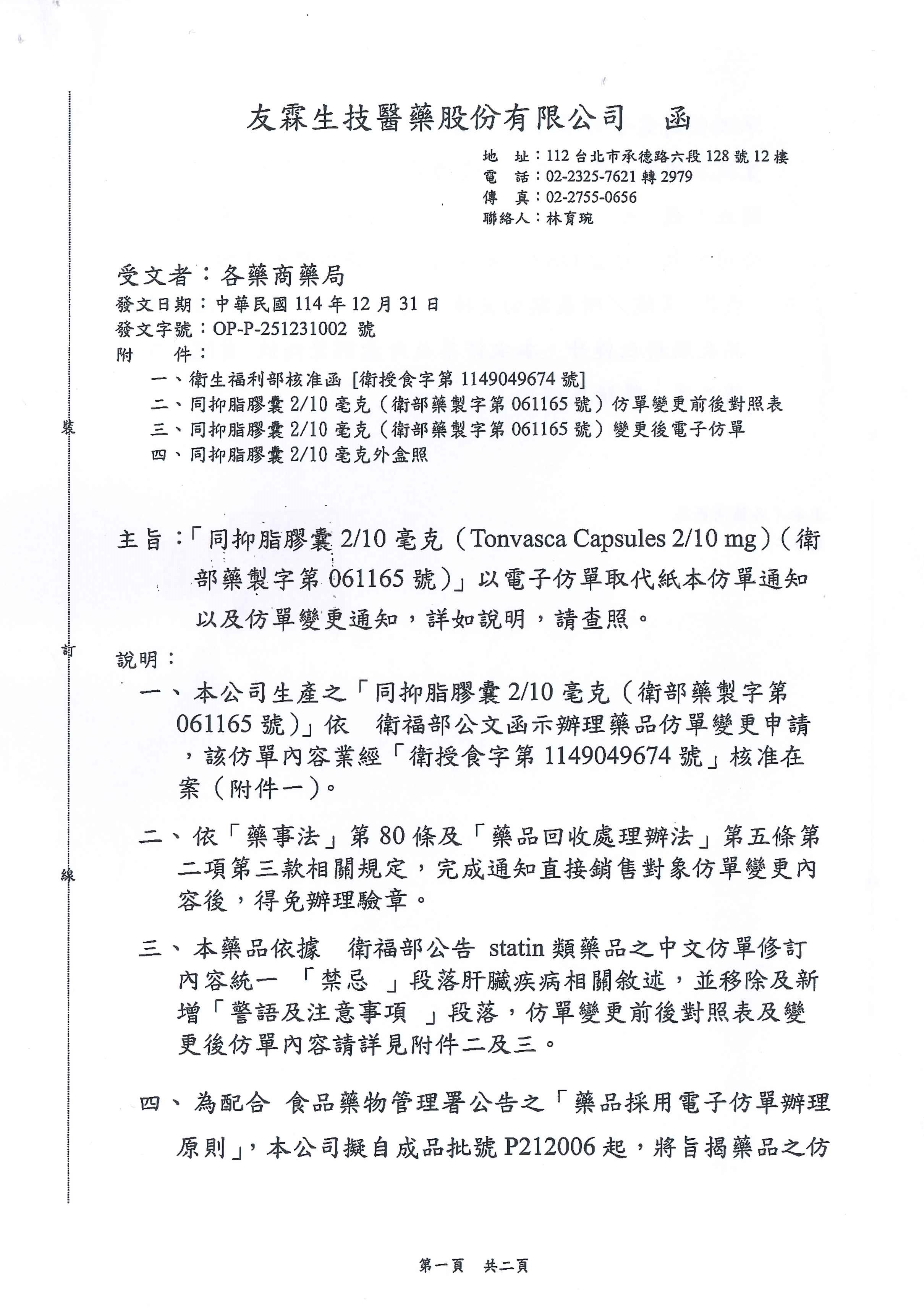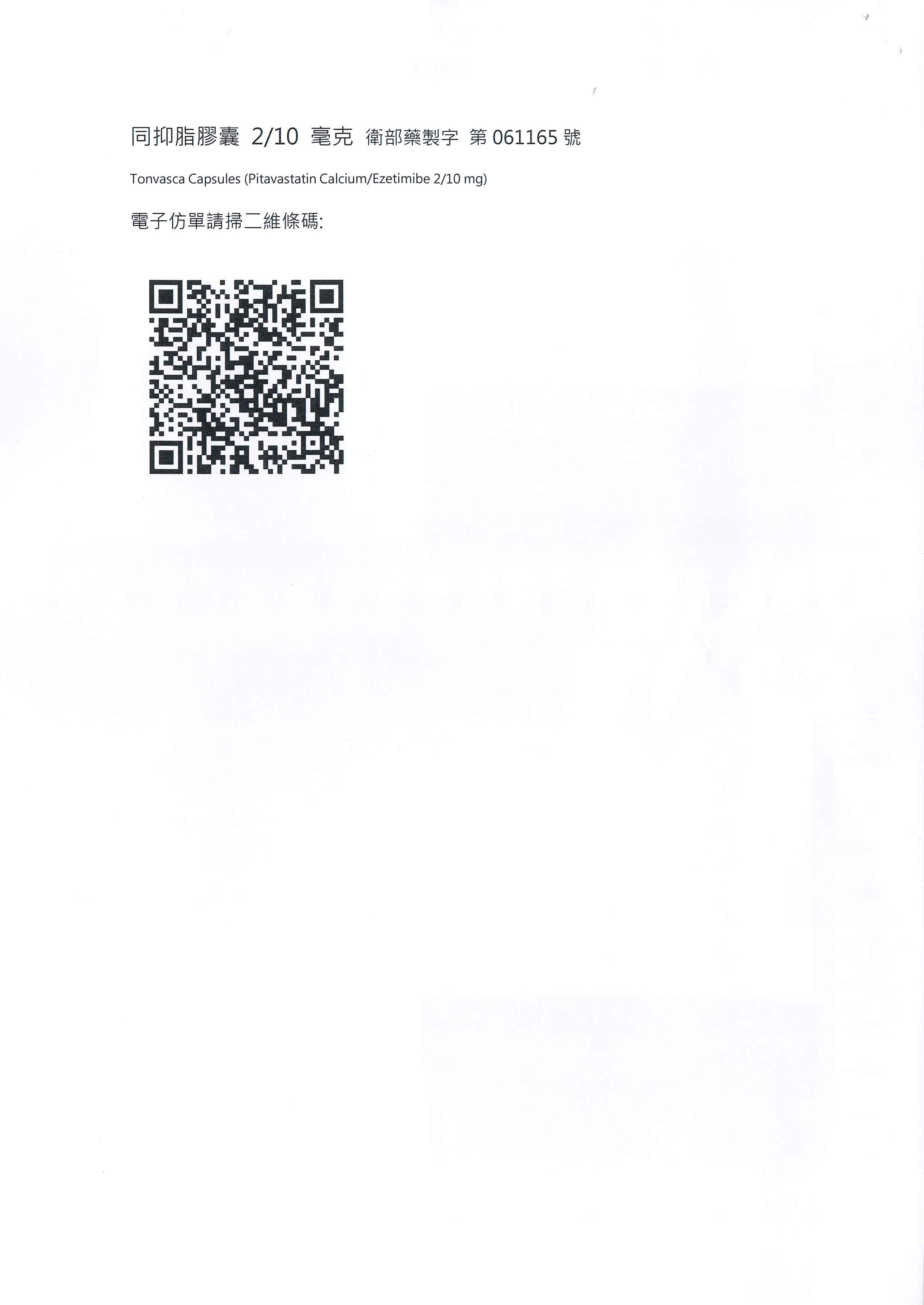 醫藥資訊:【仿單變更】同抑脂膠囊 2/10mg毫克(Tonvasca Capsules 2/10 mg)