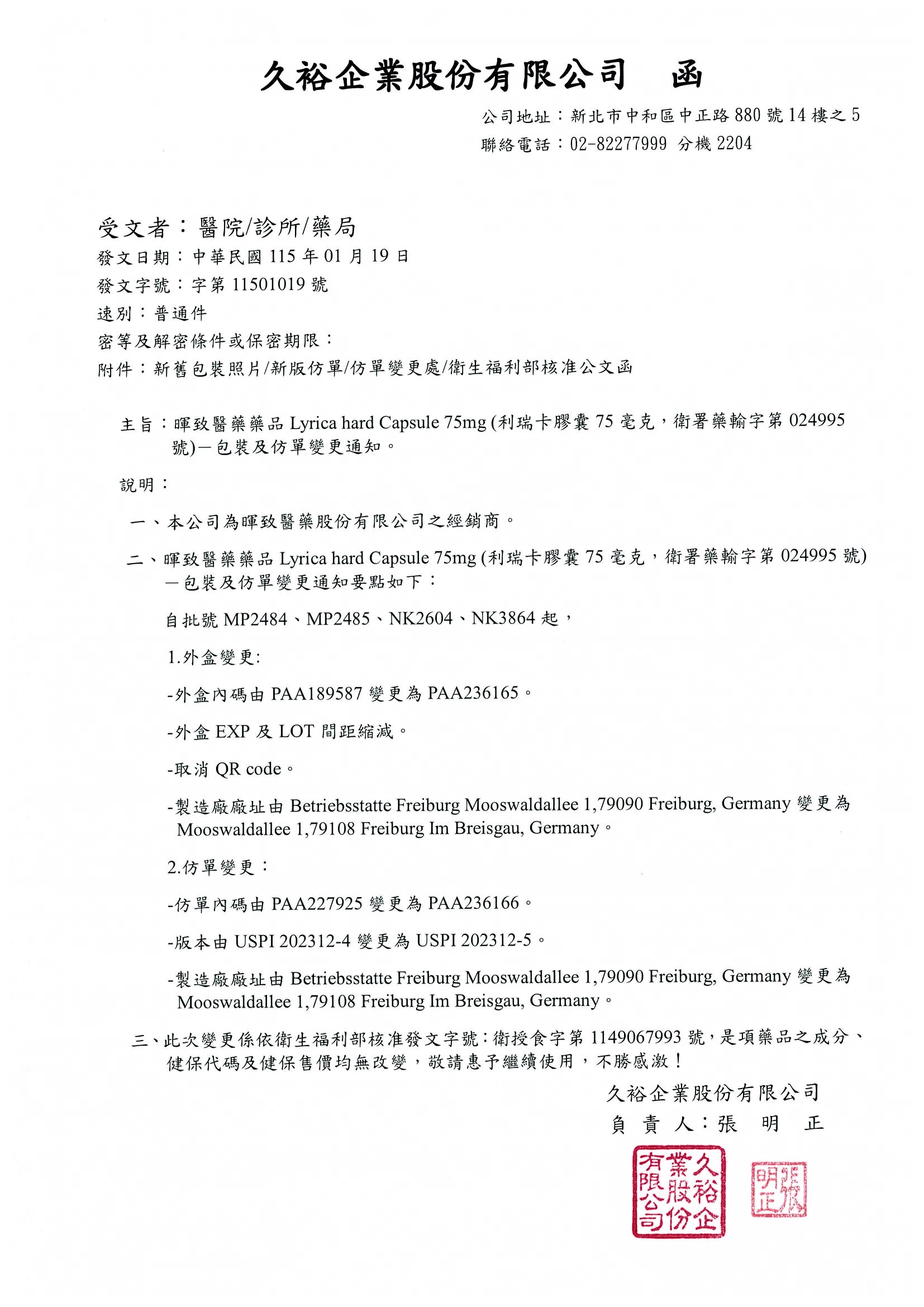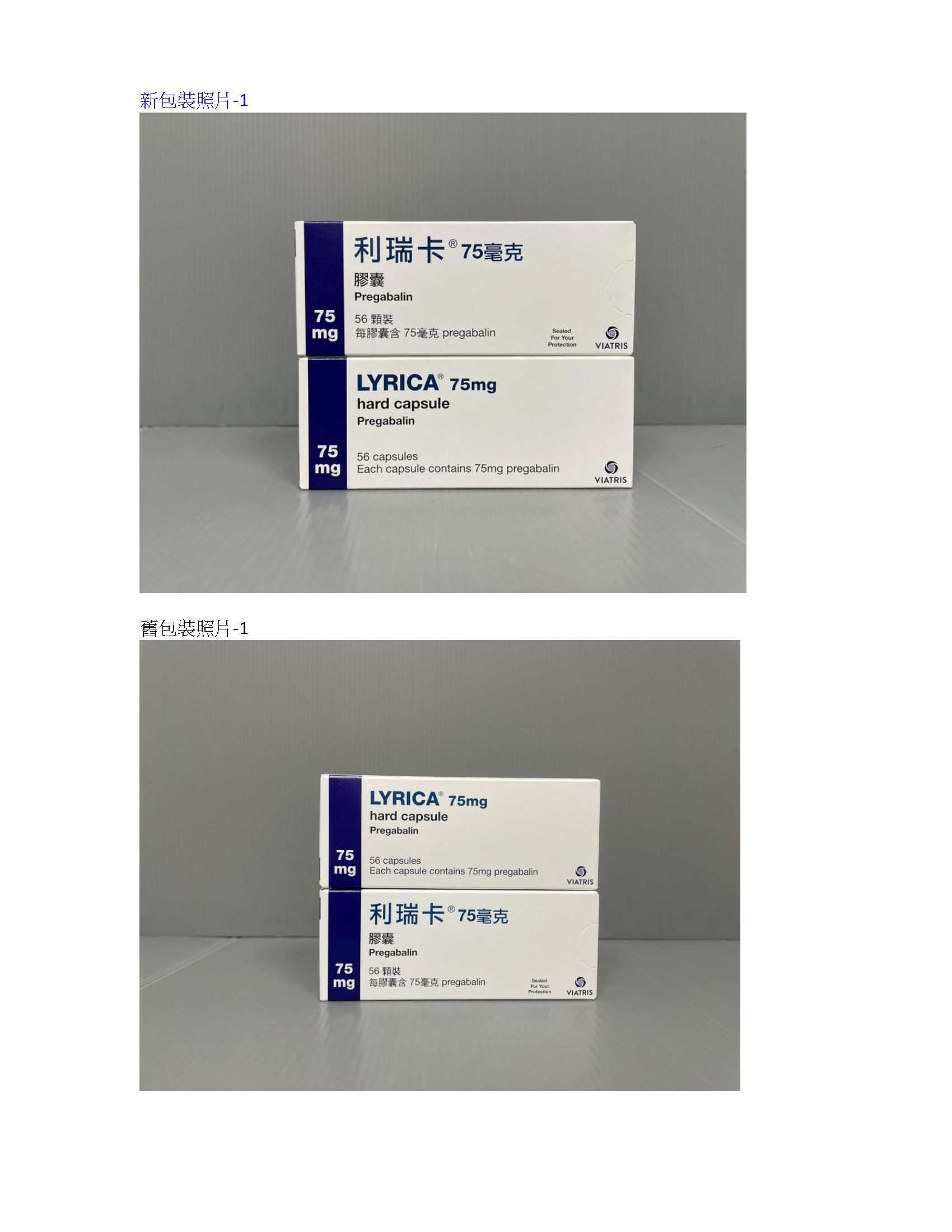 利瑞卡膠囊 75毫克(Lyrica Hard Capsule 75mg)包裝及仿單變更通知,請參照如下說明段:
