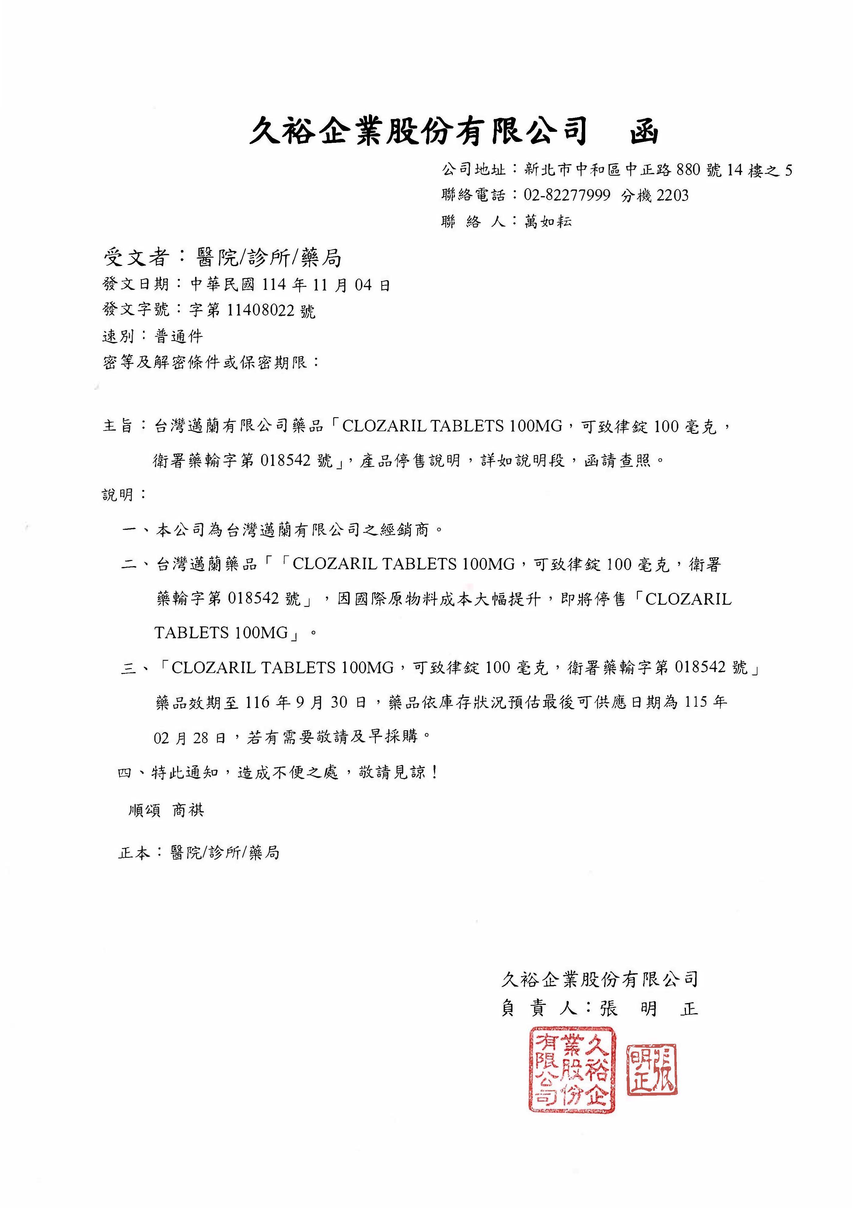 醫藥資訊:【停售】可致律錠(Clozaril Tablets 100mg)