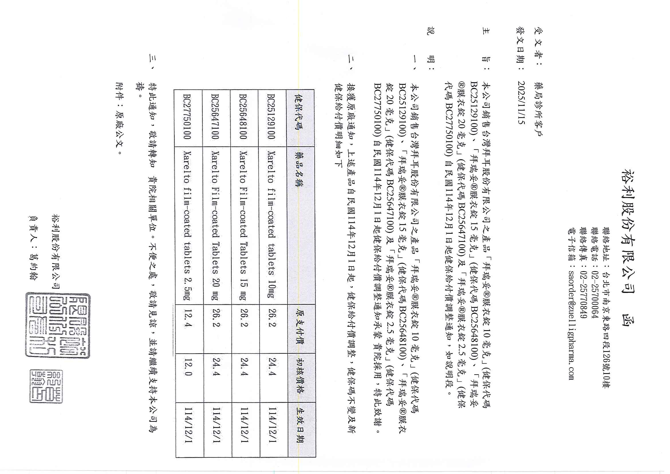 拜瑞妥膜衣錠10毫克(Xarelto Film-Coated Tablets 10 mg)、拜瑞妥膜衣錠15毫克(Xarelto Film-Coated Tablets 15 mg)、拜瑞妥膜衣錠2.5毫克(Xarelto Film-Coated Tablets 2.5 mg) 健保給付價調整通知,說明段如下: