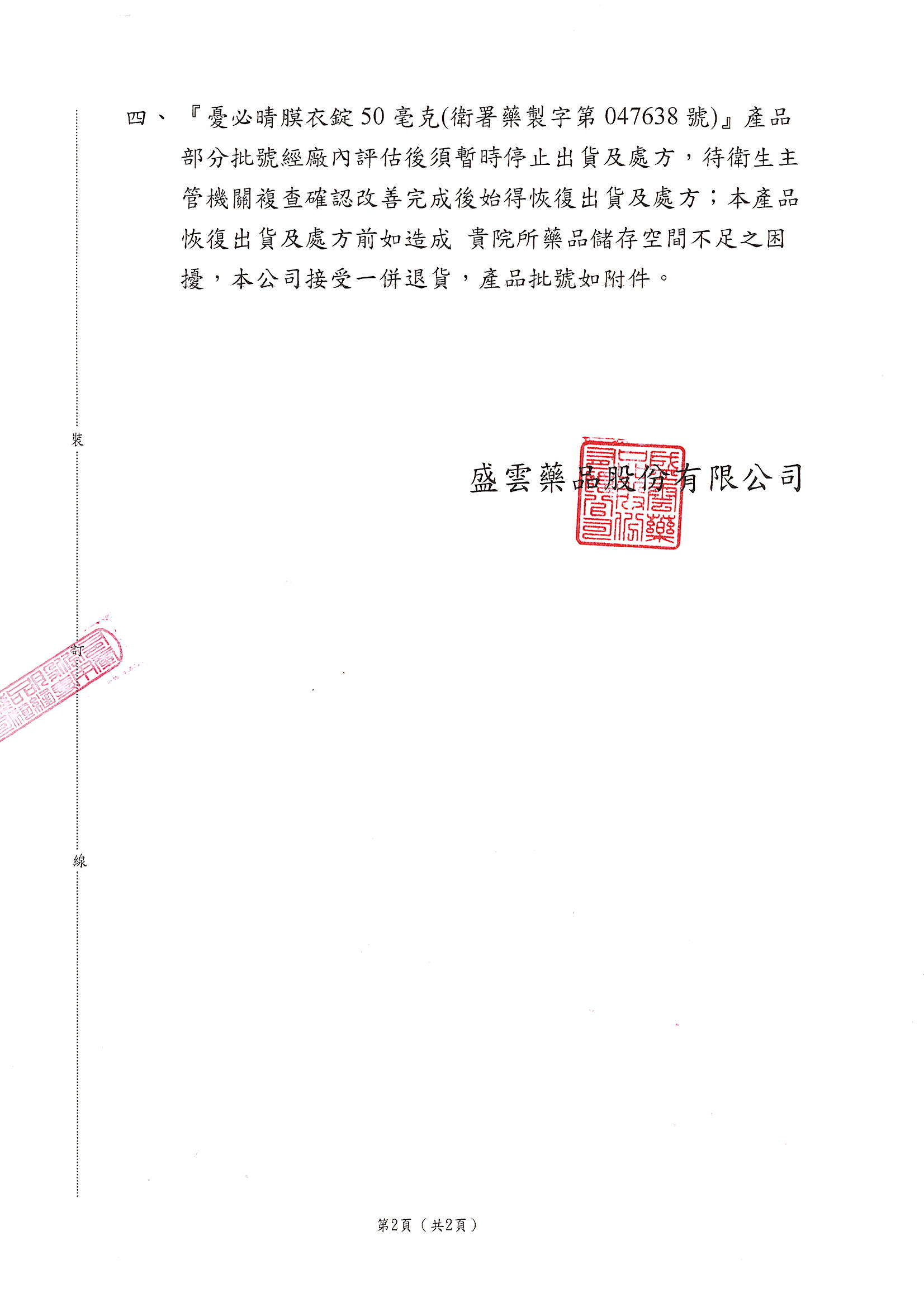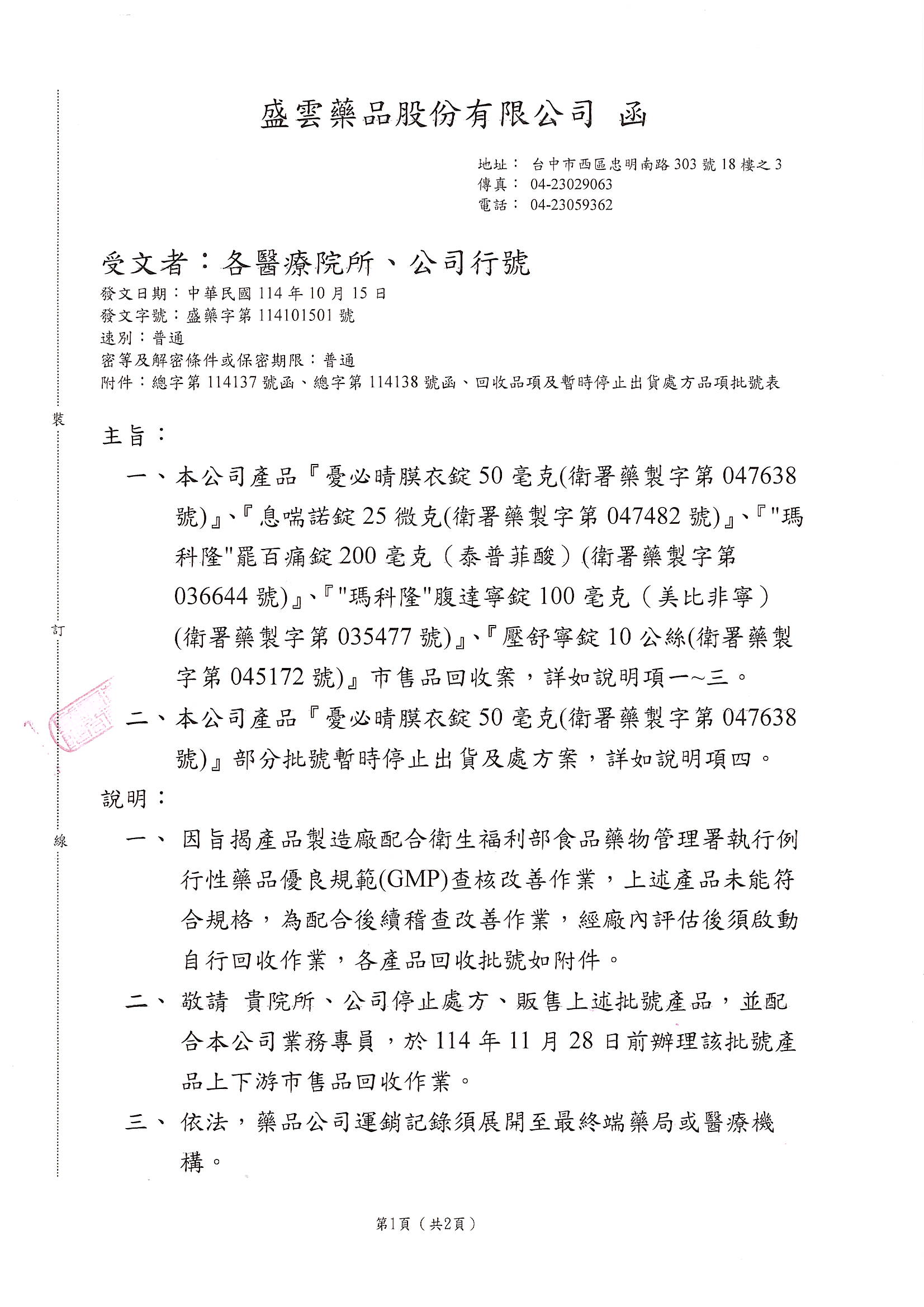 | 執行之例行性藥品優良製造規範(GMP)查核與後續改善作業,因部分產品未能符合規格,經本公司內部評估,部分批號將暫停出貨及處方使用。待衛生主管機關完成複查並確認改善措施符合規範後,將恢復正常出貨及處方作業。