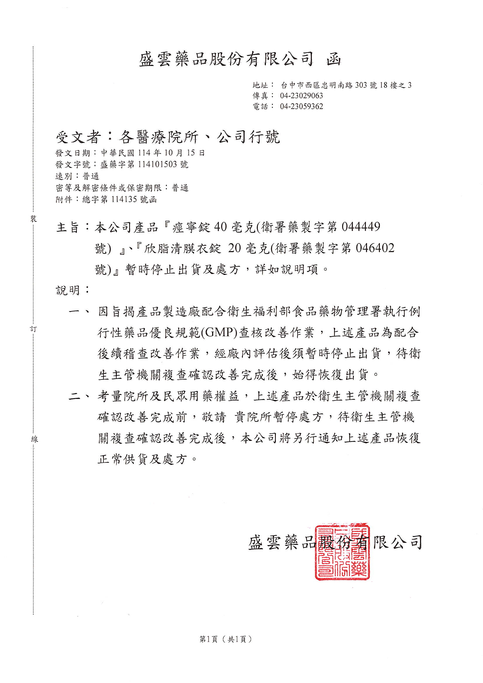| 執行之例行性藥品優良製造規範(GMP)查核與後續改善作業,因部分產品未能符合規格, 經廠內評估暫時停止出貨及處方使用。 待衛生主管機關完成複查並確認改善措施符合規範後,始得恢復正常出貨及處方作業。 |