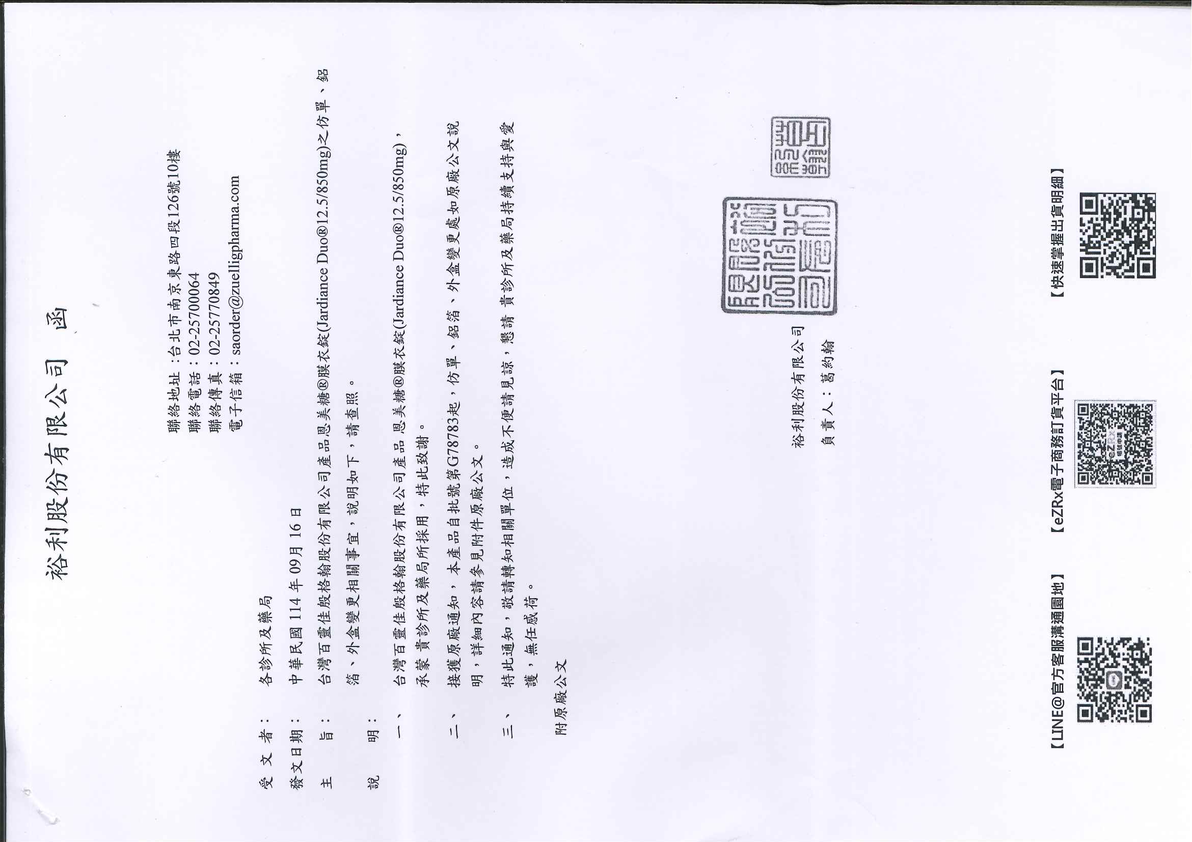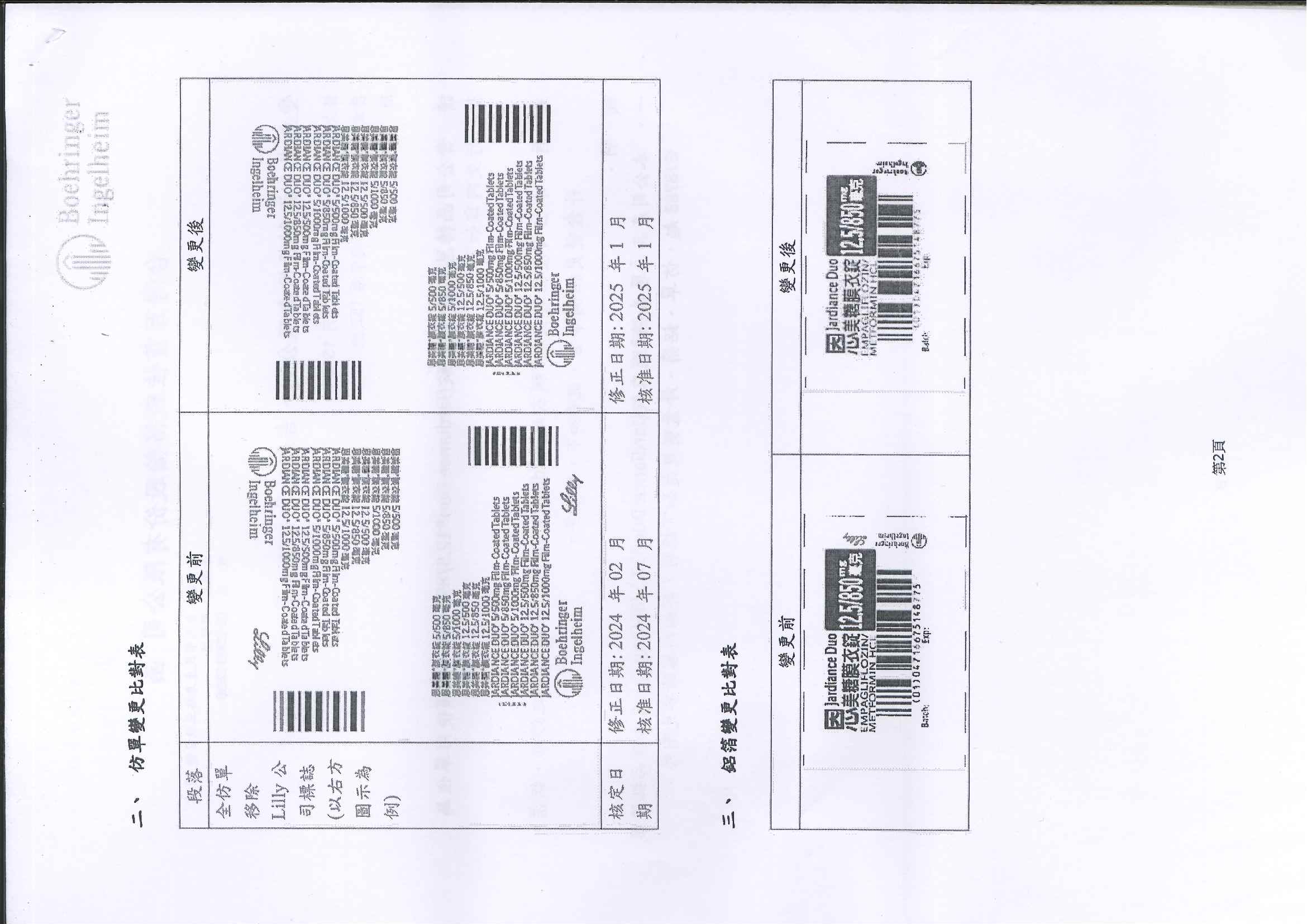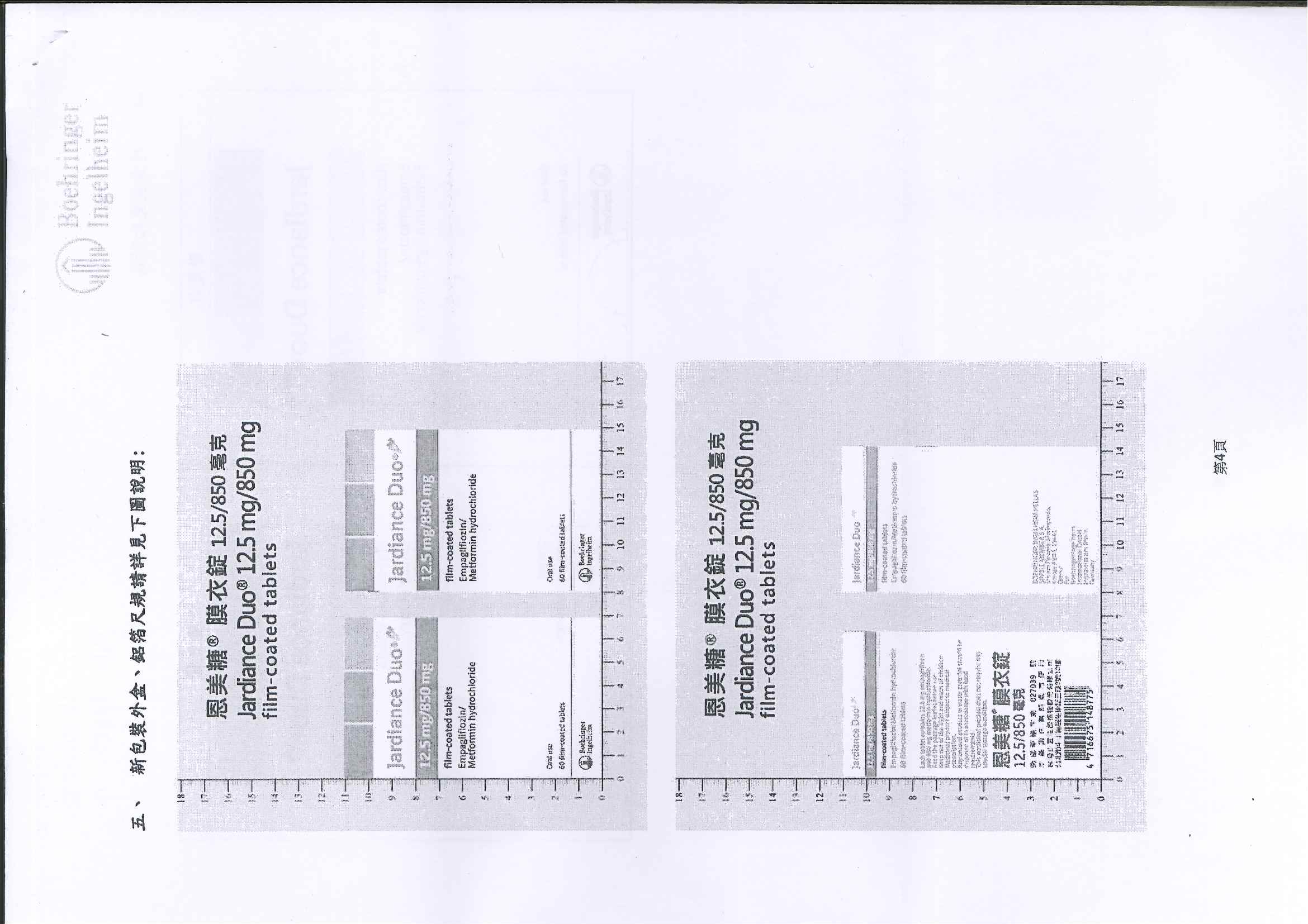 恩美糖膜衣錠 (Jardiance Duo 12.5/850mg)之仿單、鋁箔、外盒變更相關事宜,說明如下: