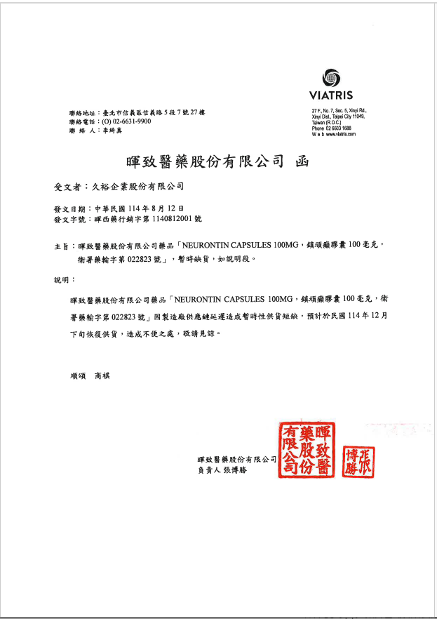 醫藥資訊:【缺貨通知】鎮頑癲膠囊100毫克(Neurontin Capsules 100mg)