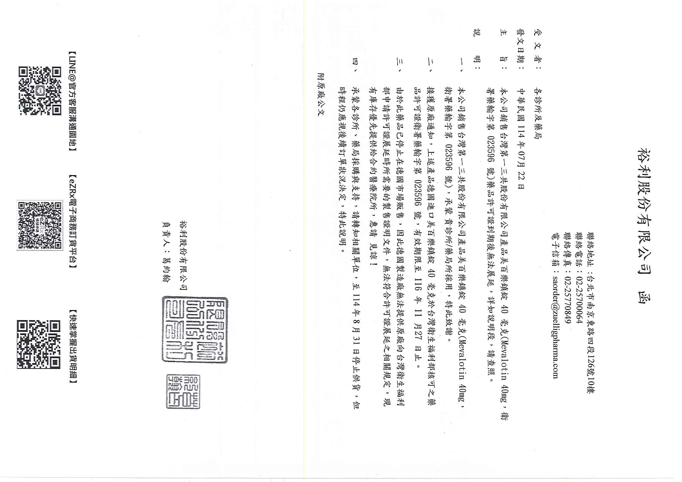 醫藥資訊:【停止供貨】美百樂鎮錠40毫克 (Mevalotin 40mg)