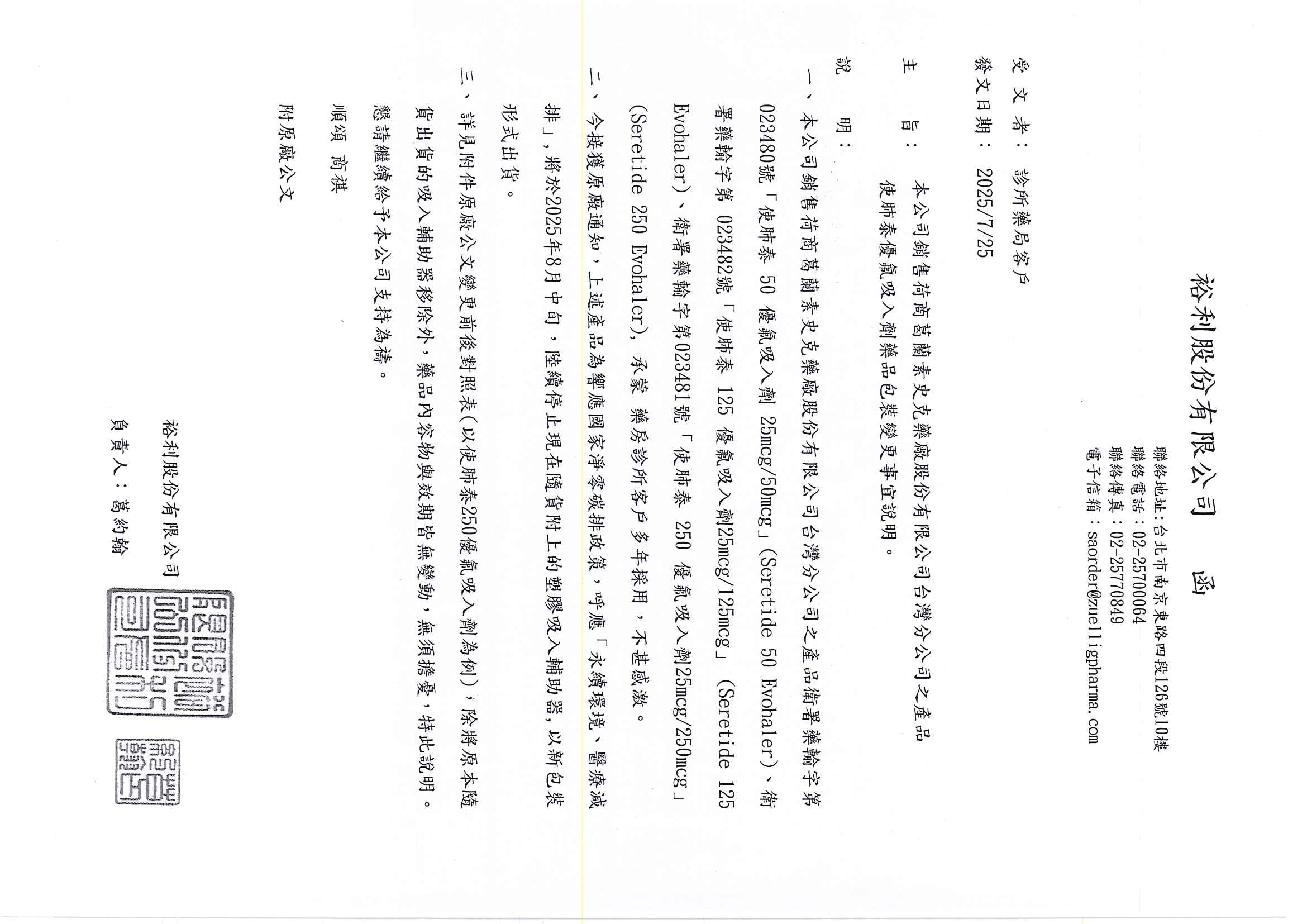 使肺泰250優氟吸入劑25mcg/250mcg (Seretide 250 Evohaler) 上述產品為響應環保,將於2025年8月中旬,陸續停止隨貨附上的塑膠吸入輔助器,以新包裝形式出貨 。