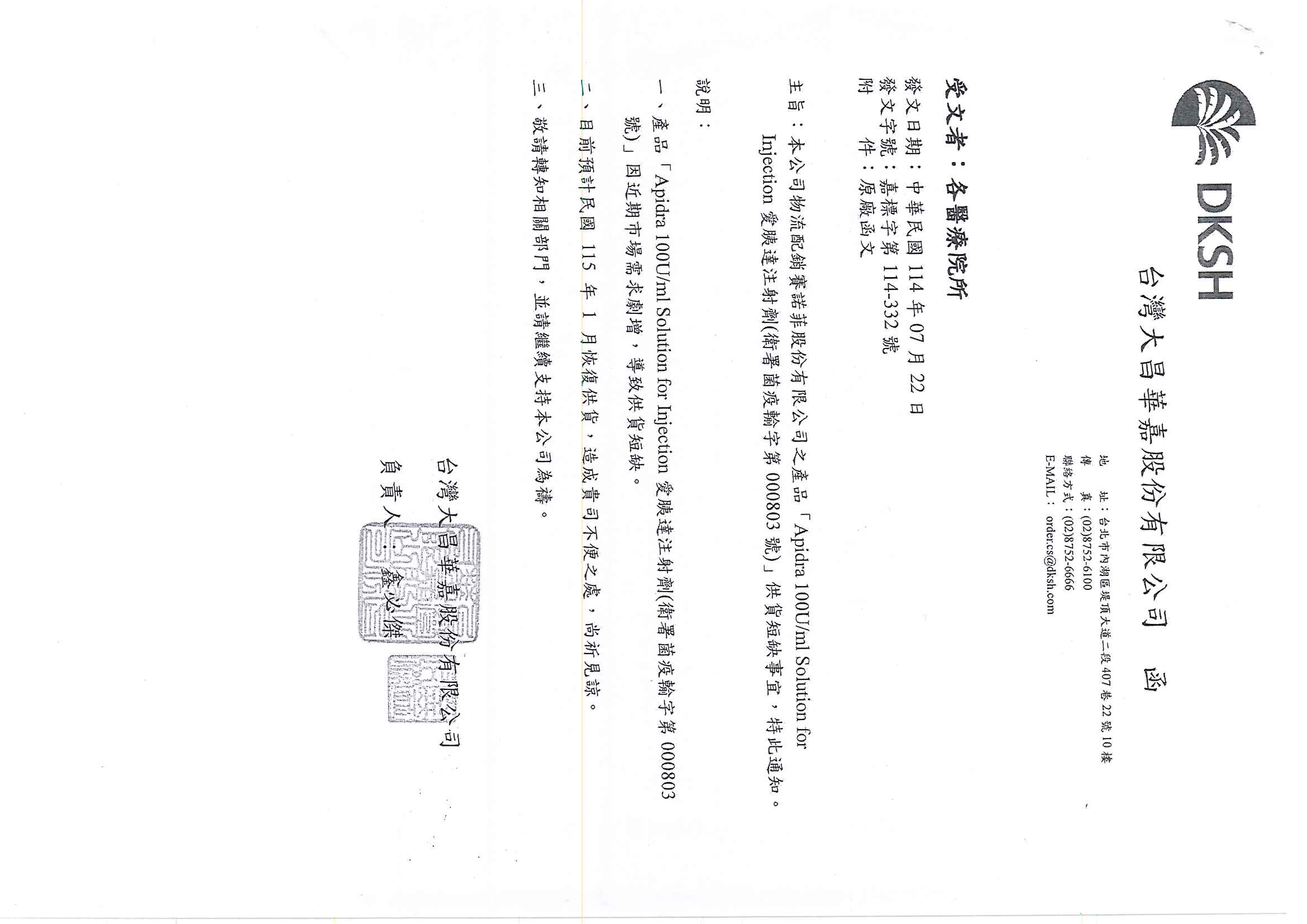 愛胰達注射劑 Apidra 100 U/ml solution for Injection (衛署菌疫輸字第000803號) 供貨短缺事宜如下,請查照。