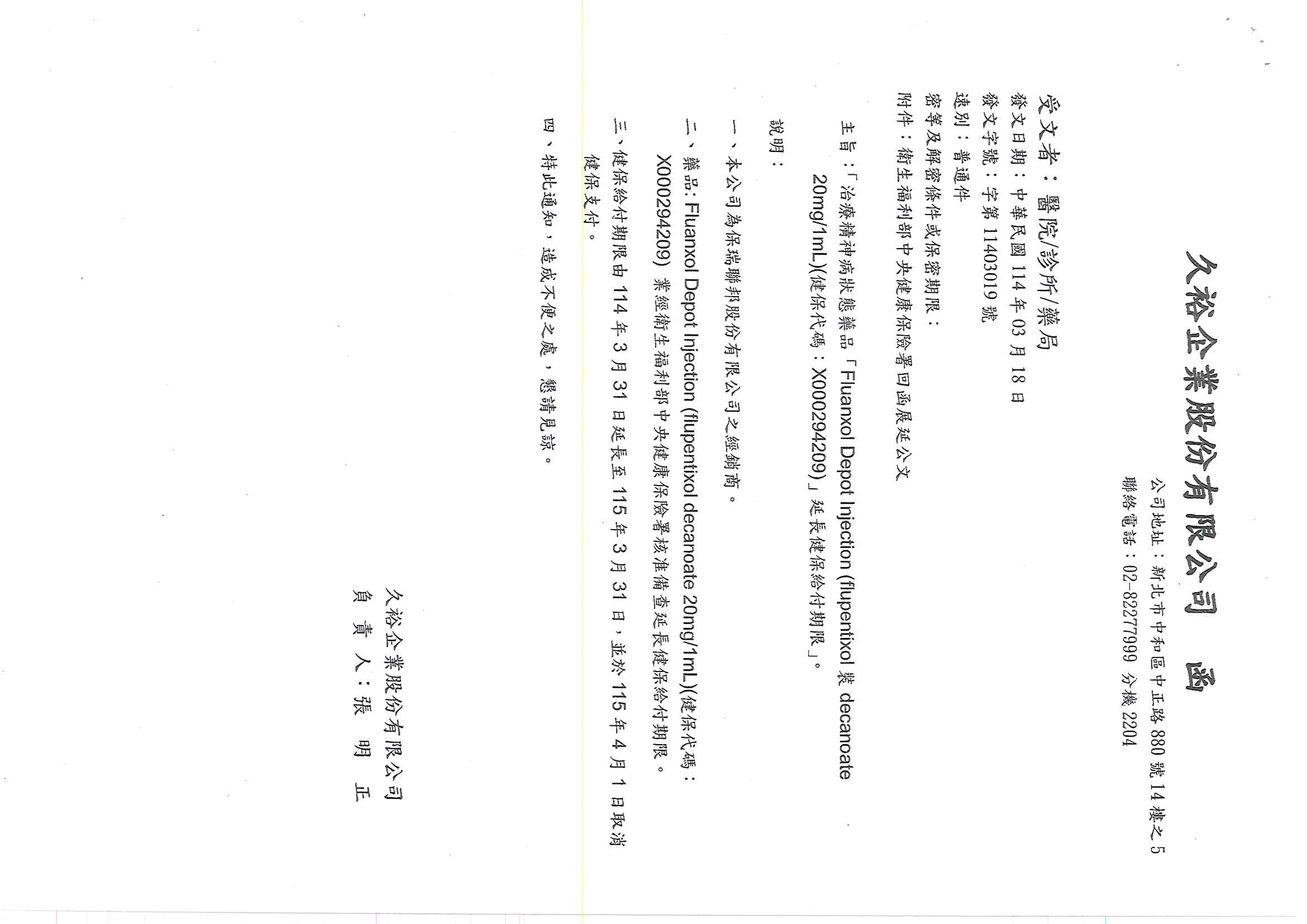 治療精神病狀態藥品「Fluanxol Depot Injection(flupentixol裝decanoate 20mg/1ml)(健保代碼:X000294209) - 延長健保給付期限