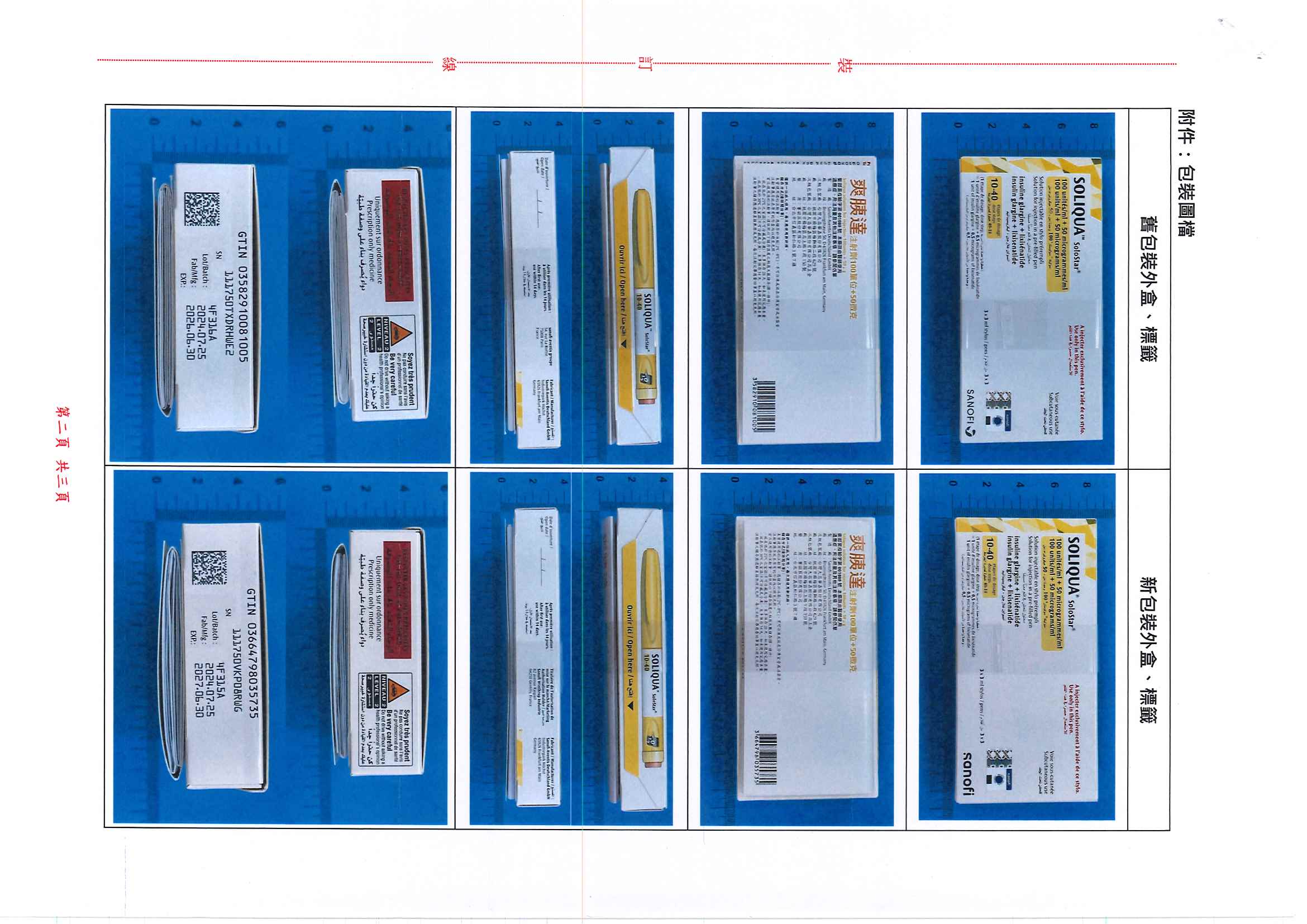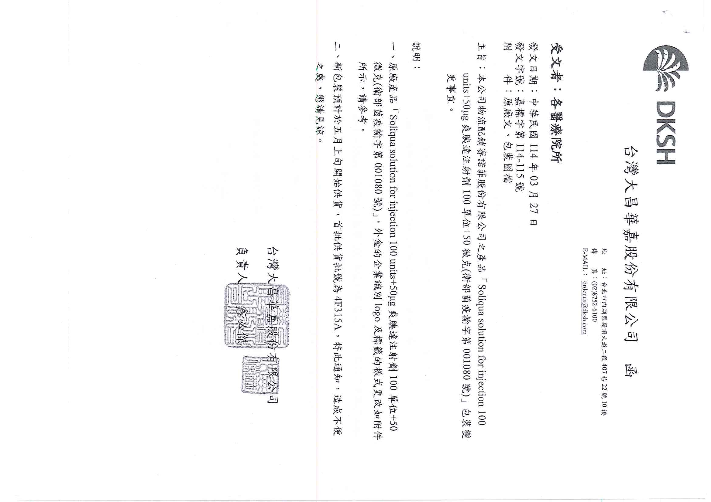 原廠產品 爽胰達注射劑100單位+50微克(Soliqua solution for injection 100 units+50μg)(衛部菌疫輸字第001080號),外盒的企業識別logo及標籤的樣式更改如附件所示,請參考如下: