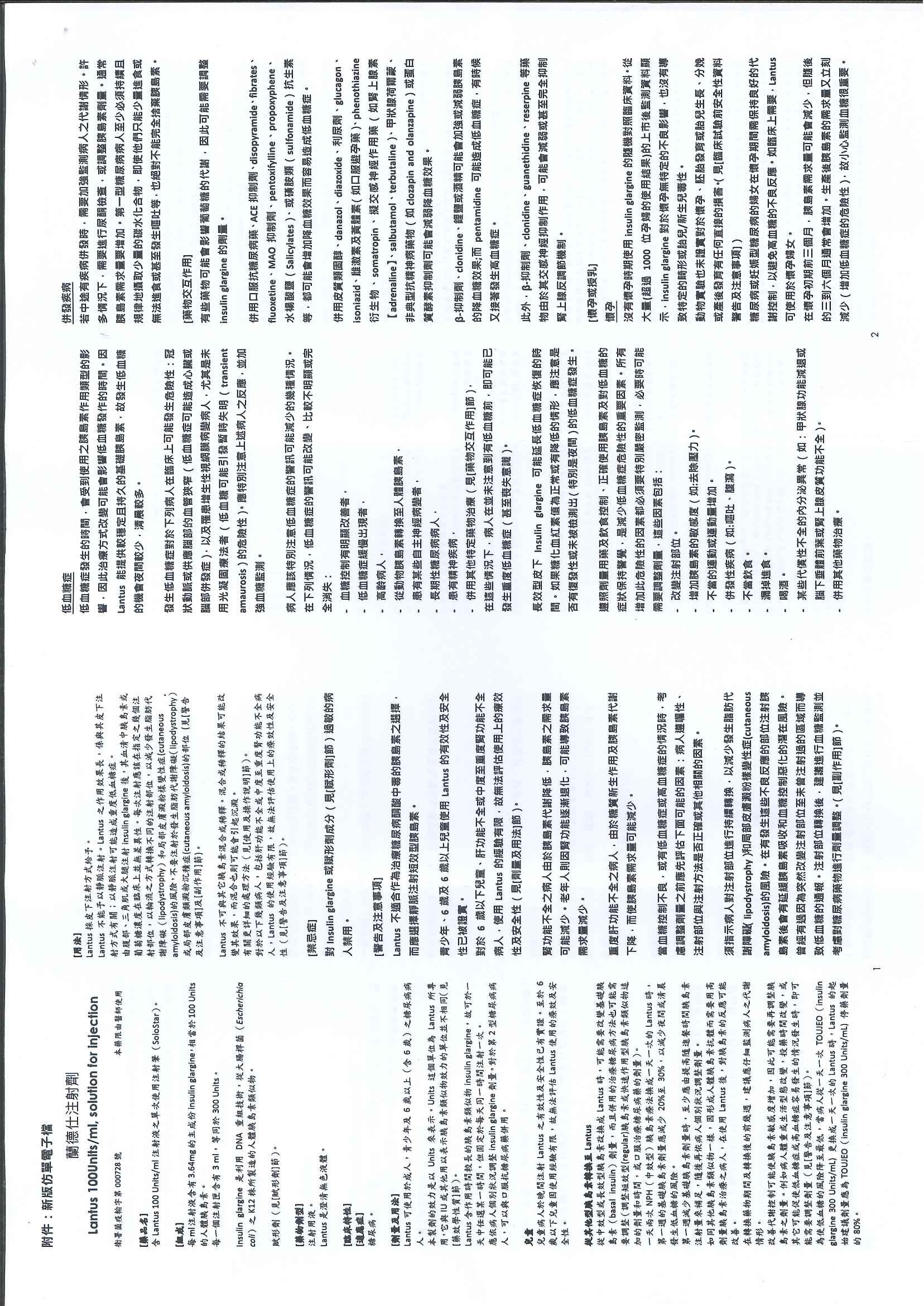蘭德仕注射劑 Lantus 100U/ml, Solution for injection(衛署菌疫輸字第000728號) ,