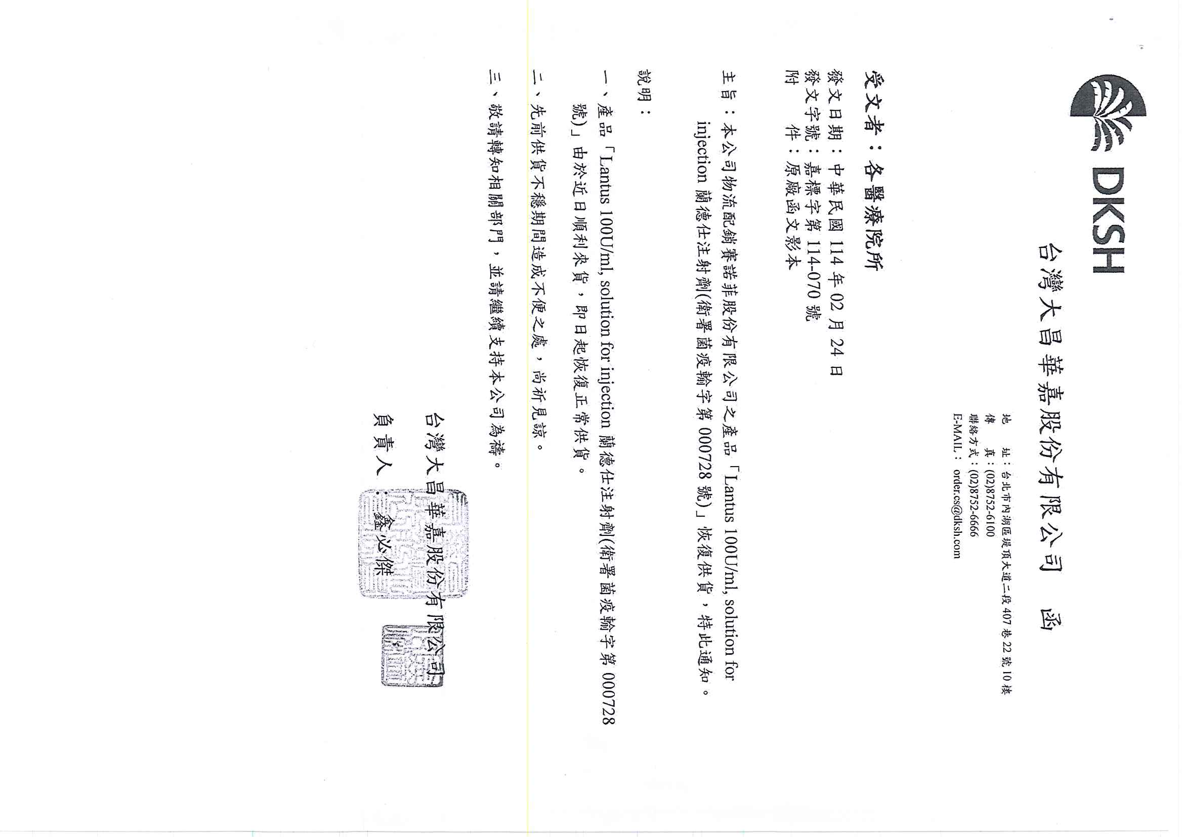 賽諾菲股份有限公司之產品 Lantus 100U/ml, Solution for injection -蘭德仕注射劑(衛署菌疫輸字第000728號) 恢愎供貨,特此通知
